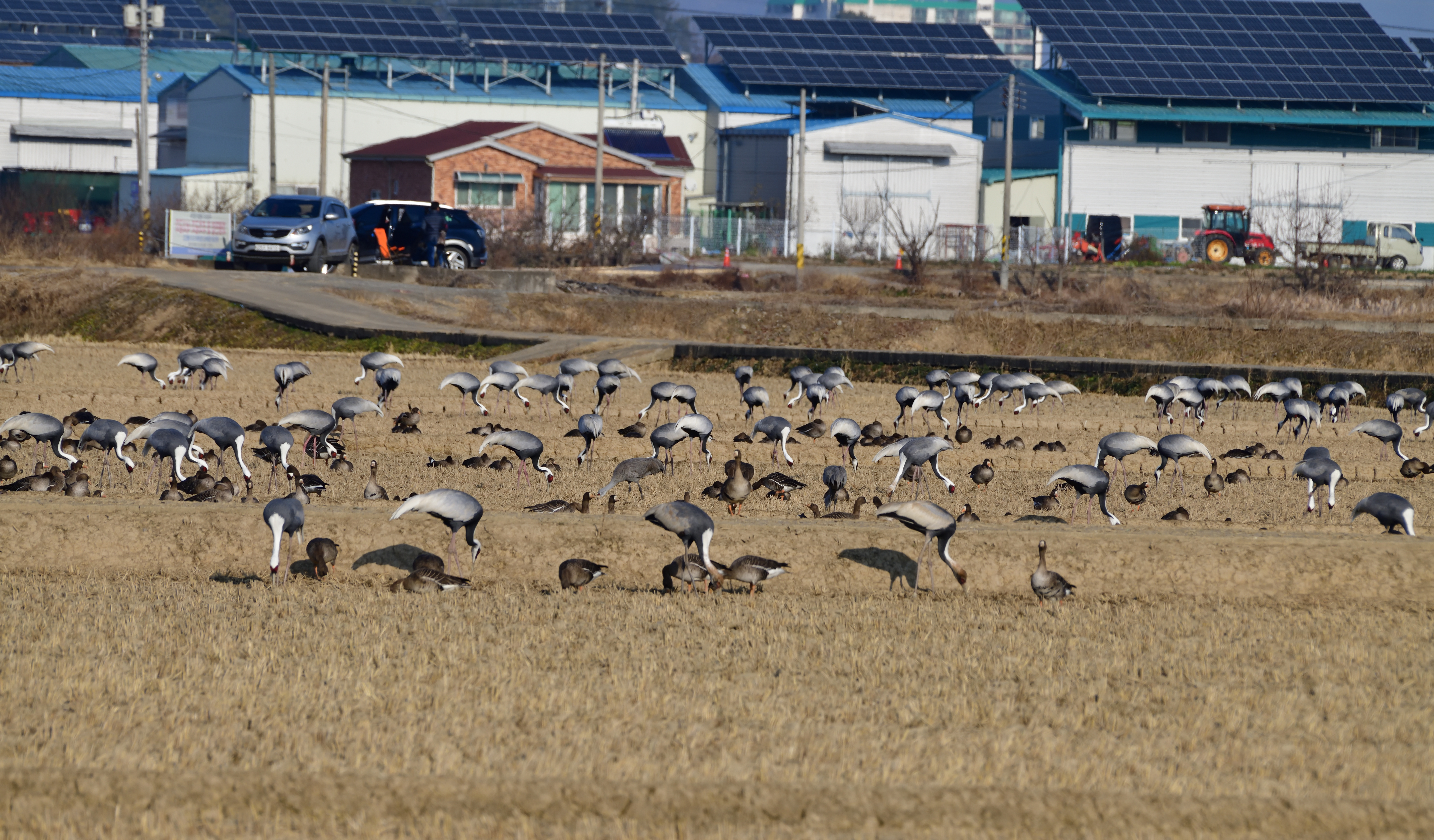 재두루미 일색이지만 흑두루미도 섞여 있다. 기러기는 주로 쇠기러기네요.